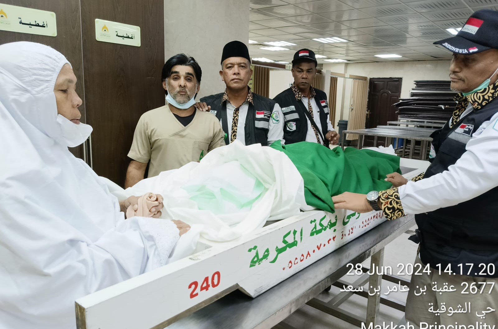 Petugas kelompok terbang (Kloter) dan petugaa lainnya mengurus jenazah almarhumah Cut Ajasapiah,89, jemaah BTJ-10 asal Gampong (Desa) Labuhan Keude, Kecamatan Rantau Selamat, Kabupaten Aceh Timur wafat subuh, Jumat 28 Juni 2024, pukul 06.46 Waktu Arab Saudi (WAS) atau 10.46 WIB. | Foto Panitia Haji