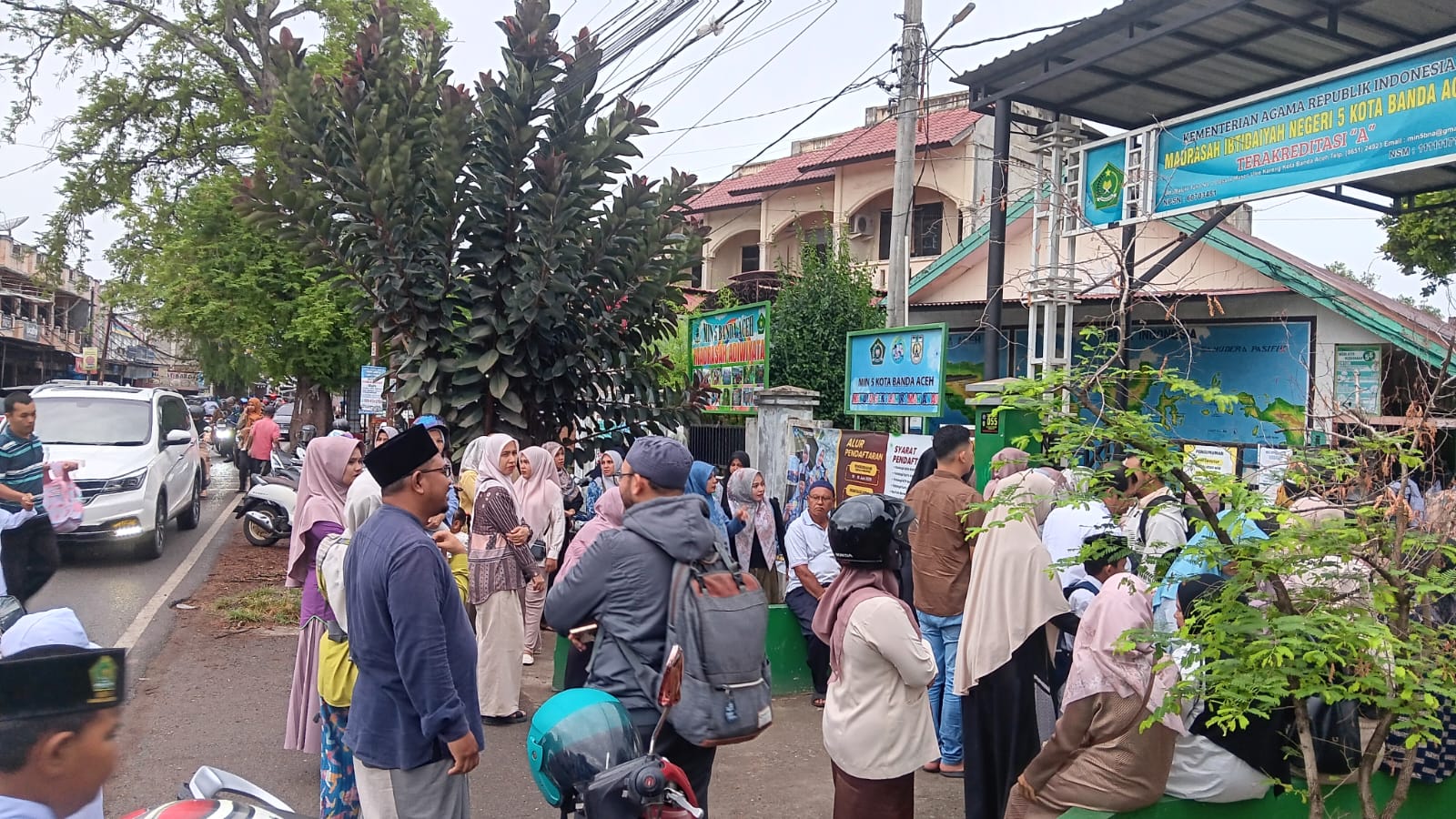 Sejak pukul 07.00 WIB, halaman sekolah yang terletak di kawasan Ulee Kareng itu mulai dipadati kendaraan pribadi dan sepeda motor. Beberapa orang tua terlihat membawa payung, bersiap jika hujan turun.