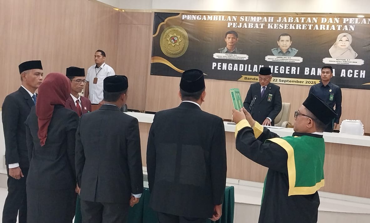 DONYAPOST, Banda Aceh – Ketua Pengadilan Negeri (PN) Banda Aceh, Dr. Teuku Syarafi, SH, MH, melantik tiga pejabat baru di lingkungan kesekretariatan PN Banda Aceh. Pelantikan berlangsung khidmat di Aula PN Banda Aceh, Senin (22/9/2025).