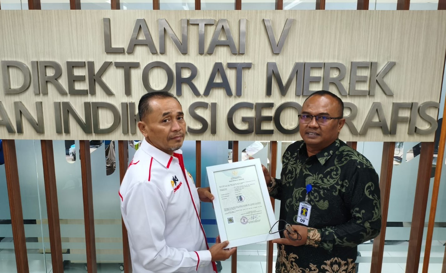 Penyerahan sertifikat dilakukan oleh Bayu Susanto dari DJKI kepada Hendra, yang juga menjabat Kepala UPTD Inseminasi Buatan dan Inkubator Dinas Peternakan Aceh.