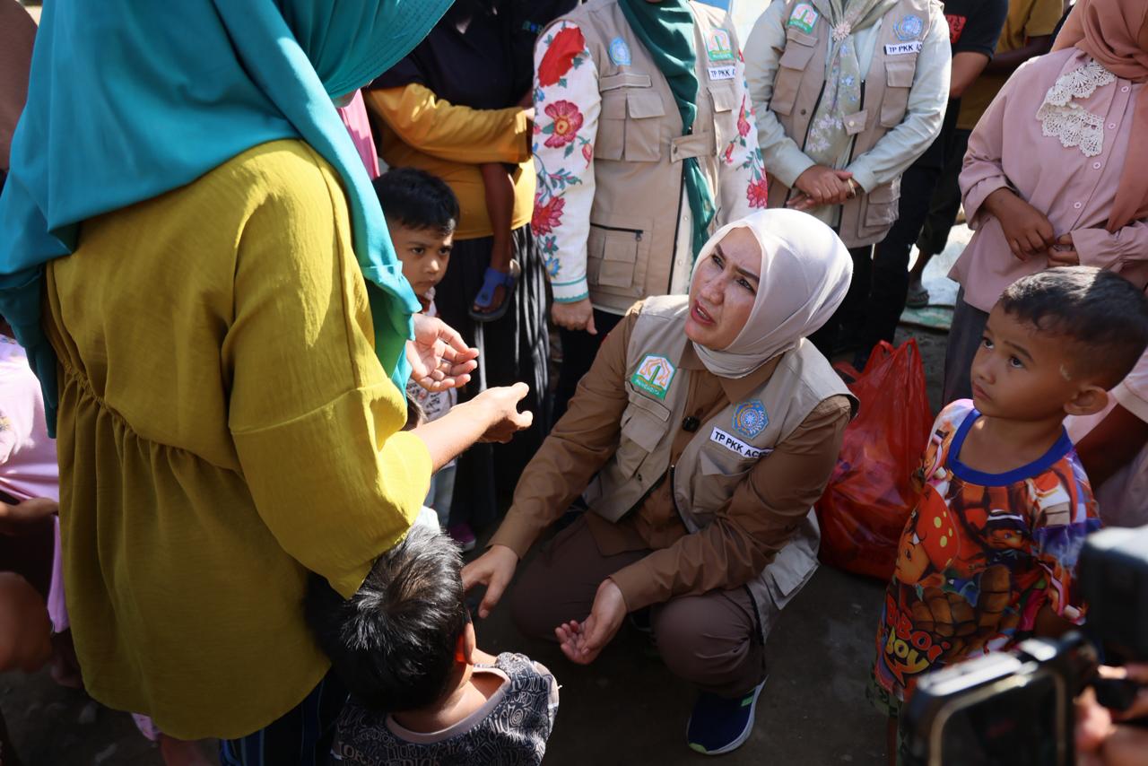 Di antara tumpukan bantuan dan wajah-wajah lelah warga terdampak banjir, Ketua TP PKK Aceh Marlina Muzakir—yang akrab disapa Kak Na—tampak sibuk menanyakan keluhan kesehatan warga, memilihkan obat, lalu menyerahkannya satu per satu.