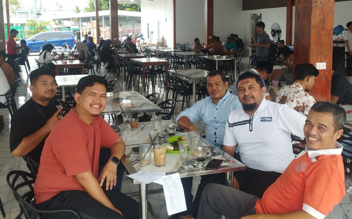 Pelatih Timnas Futsal Eka Sanjaya (kiri) ngopi bersama pengurus AFA, Selasa (14/4/2026) sore.