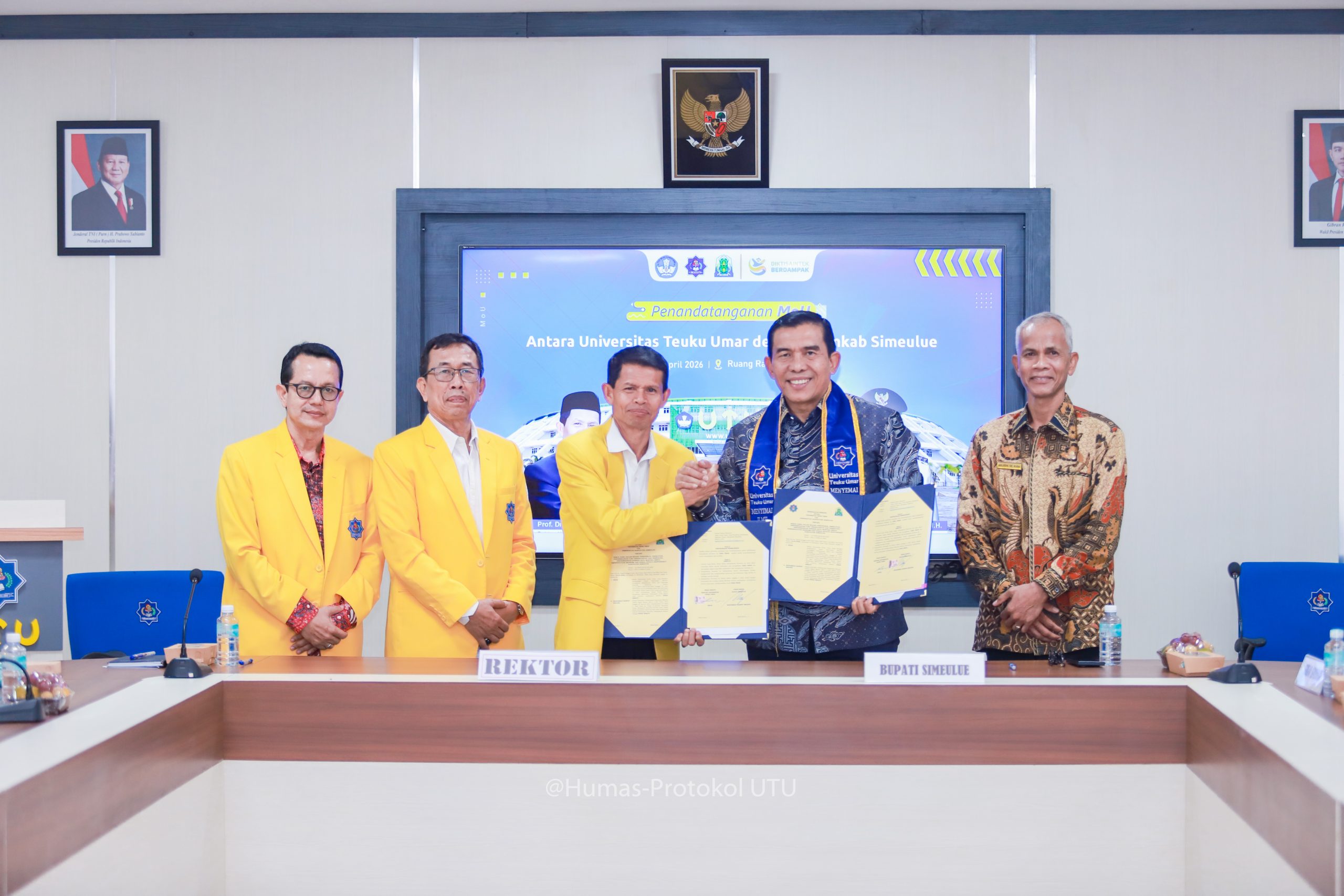 Penandatanganan berlangsung di Ruang Rapat Senat UTU, Kamis (16/4/2026), antara Rektor UTU Prof. Dr. Ishak Hasan, M.Si dan Bupati Simeulue Mohammad Nasrun Mikaris, S.H., M.H., disaksikan jajaran pimpinan kampus serta perwakilan SKPK Simeulue.