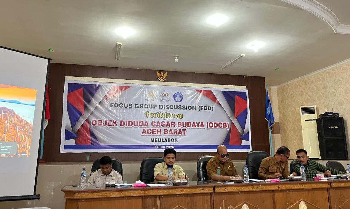 DONYAPOST, Meulaboh — Dinas Pendidikan dan Kebudayaan (Disdikbud) Kabupaten Aceh Barat bersama Tim Ahli Cagar Budaya (TACB) dan Tim Pendaftaran Cagar Budaya (TPCB) menggelar Forum Group Discussion (FGD) Objek Diduga Cagar Budaya (ODCB) Tahun 2026, Selasa (28/4/2026) di Aula Disdikbud setempat.